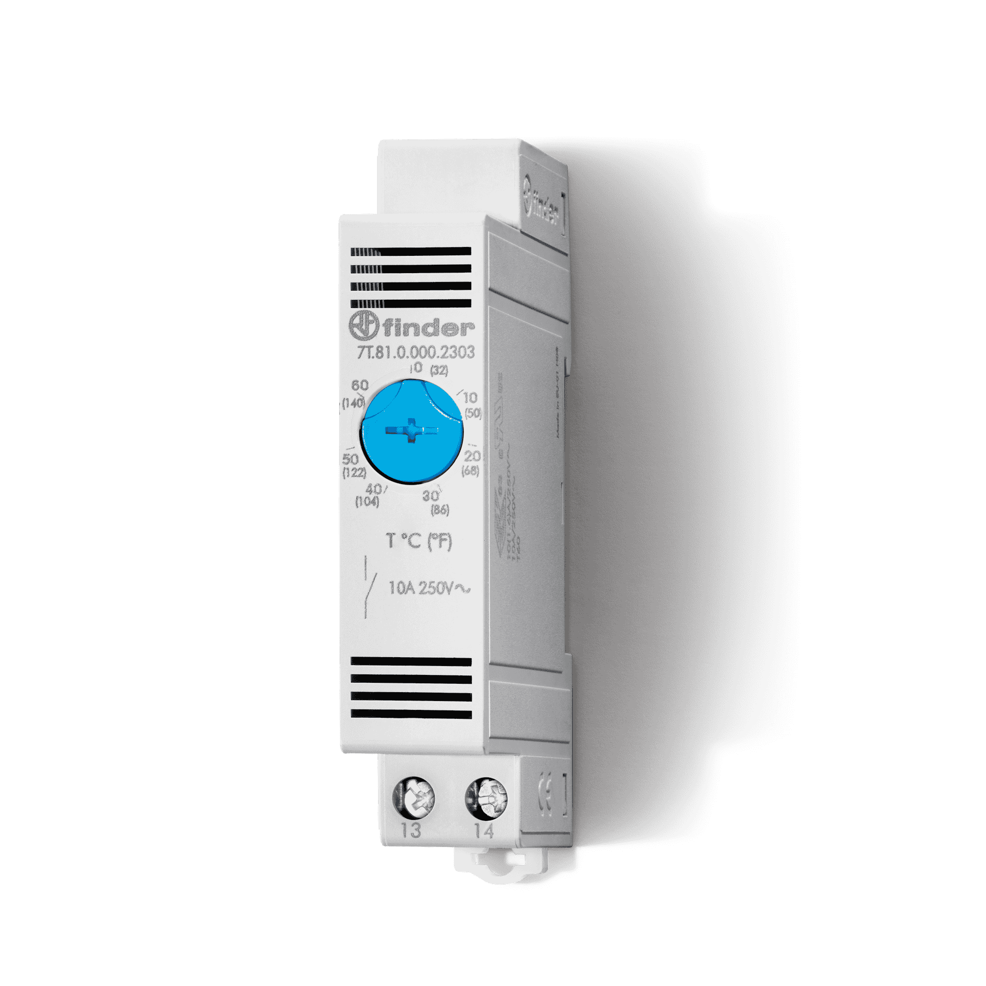 Descrição comercial: Termostato de painel de pequenas dimensões para acionamento da ventilação. Com contato bimetálico, ampla faixa de ajuste e dimensões de 17,5mm para montagem em trilho de 35mm (EN 60715).