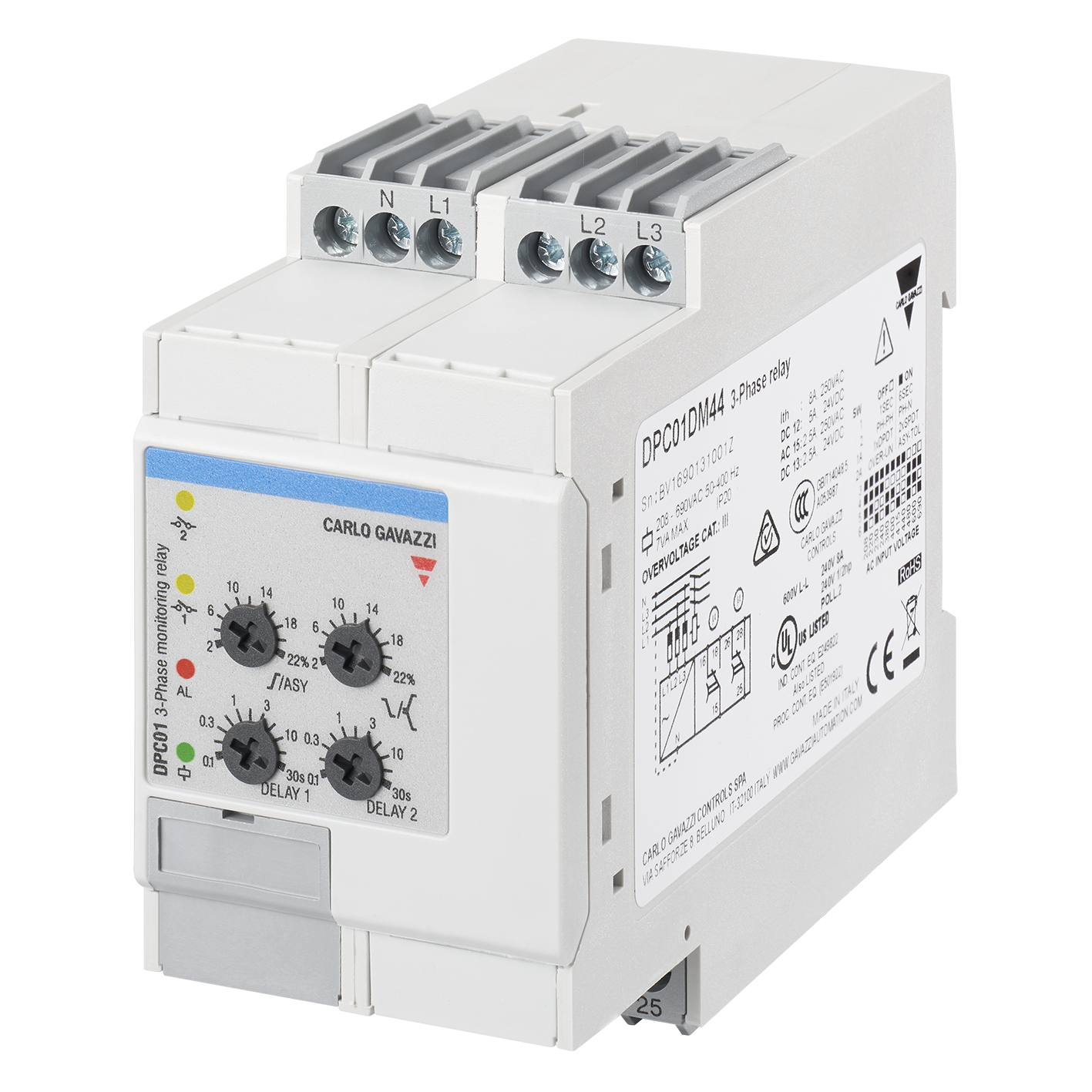 Relé de monitoramento trifásico para perda de fase, sequência, assimetria, tolerância, sobretensão e subtensão, faixa nominal de 440-480 V CA, retardo no alarme de 0,1 a 30 s, 2 saídas de relé SPDT, caixa para trilho DIN de 45 mm.